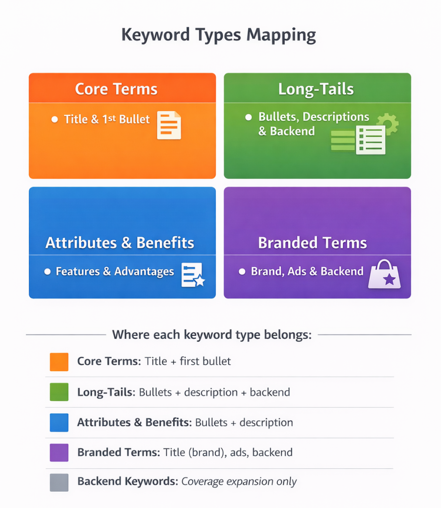 One reason keyword work feels overwhelming is that sellers treat all keywords the same. In reality, different keyword types play different roles in a healthy listing.